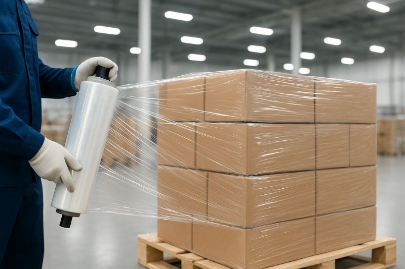 - Sản lượng đóng gói lớn: Nên cân nhắc đầu tư máy quấn pallet và sử dụng màng PE quấn máy để tăng năng suất và đảm bảo lực siết đồng đều.
